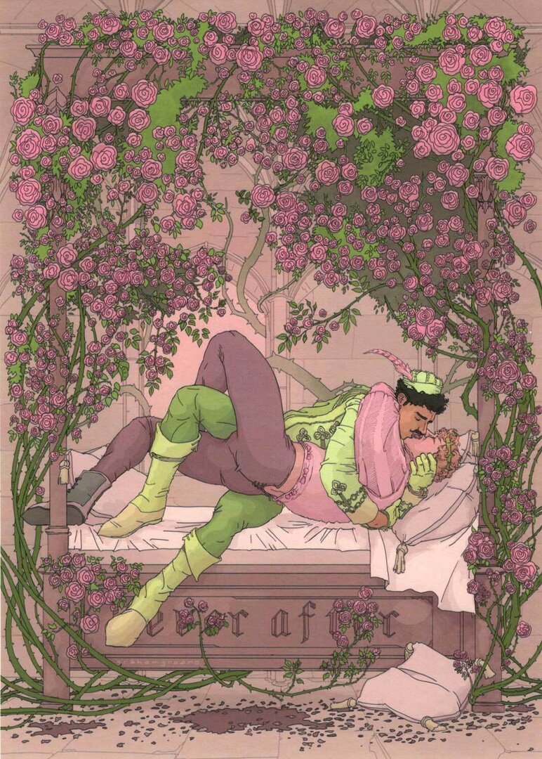 „Ever After.“ hat Graham Groans seine aktuelle Werkserie betitelt. Darin interpretiert der Leipziger Illustrator bekannte Märchen neu und verortet sie in einem queeren Lebensumfeld. Die märchenhaften Details aus Schneewittchen, Aladin oder Dornröschen fehlen dabei natürlich nicht. So fantastisch seine Darstellungen auch sind, umso schöner ist die Selbstverständlichkeit, mit der die queeren Charaktere hier als Protagonisten agieren. Märchen gründen ja auf Lebensrealitäten und so sind Groans‘ Werke eine überfällige Weiterentwicklung Disneyscher Welten, die das Queere viel zu lange schrill oder böse erzählt haben und erst in den letzten Jahren, ihren Figuren eine romantische Märchengegenwart gönnen.