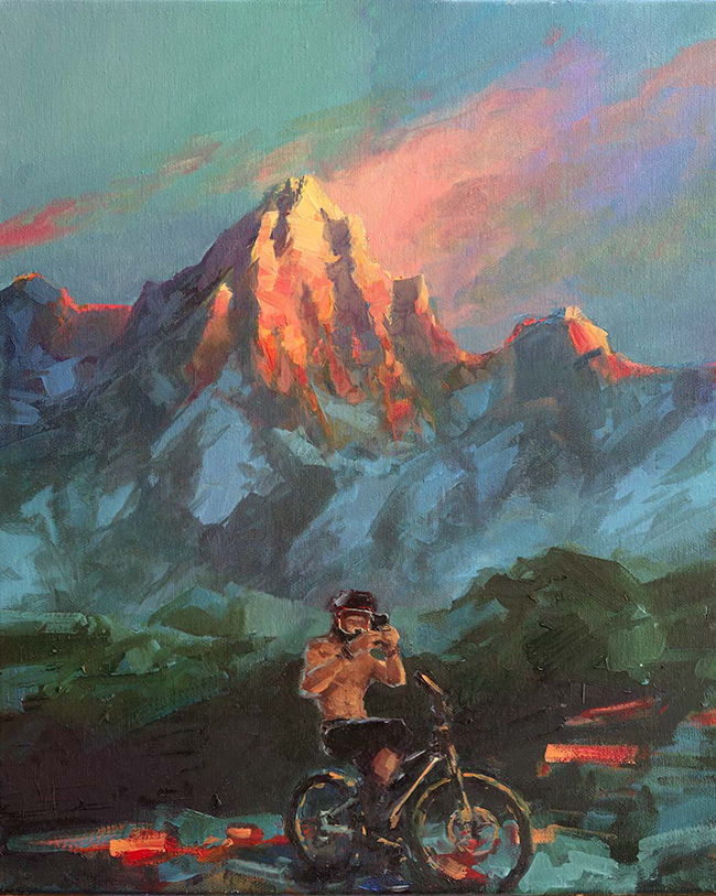 Jenes kurze, intensive Aufleuchten der Berge im letzten Sonnenlicht dient in einem der neuen Werke als visuelles Motiv. Doch anstelle klassischer Landschaftsromantik zeigt Rore einen Downhill-Biker, der den Moment mit einem Selfie festhält. Der Begriff „Männerglühen“ wird dabei zur poetischen Metapher für Robert C. Rores virtuoses Spiel mit männlicher Körperlichkeit und Schönheit – eine Schönheit, die nicht beweisen muss, dass sie existiert. Sie ist einfach da, für einen Moment, bevor sie vergeht. Wie das Alpenglühen selbst: monumental, strahlend und doch flüchtig.